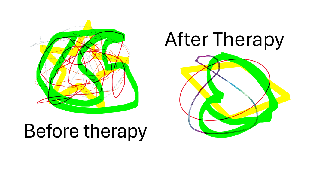 Our mind before therapy might look something similar to this. Many mixed up feelings with lots of loose ends. After therapy there are less loose ends and our mind feels clearer and we are able to make decisions.